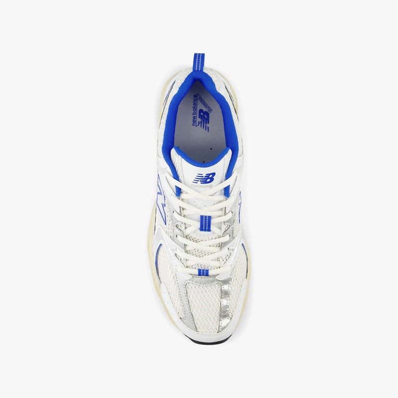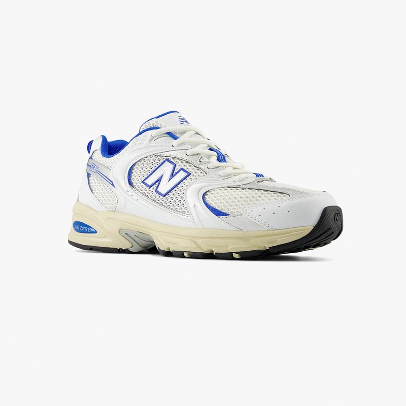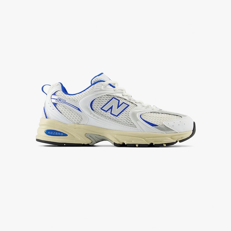 The New Balance 530 features a 2000s aesthetic, combining everyday style with the modern technology of ABZORB cushioning. Equipped with a blend of white, silver and blue throughout the upper, this NB 530 features vintage yellowed midsole, an adjustable lace-up closure and is constructed with a mix of synthetic and mesh for maximum comfort.