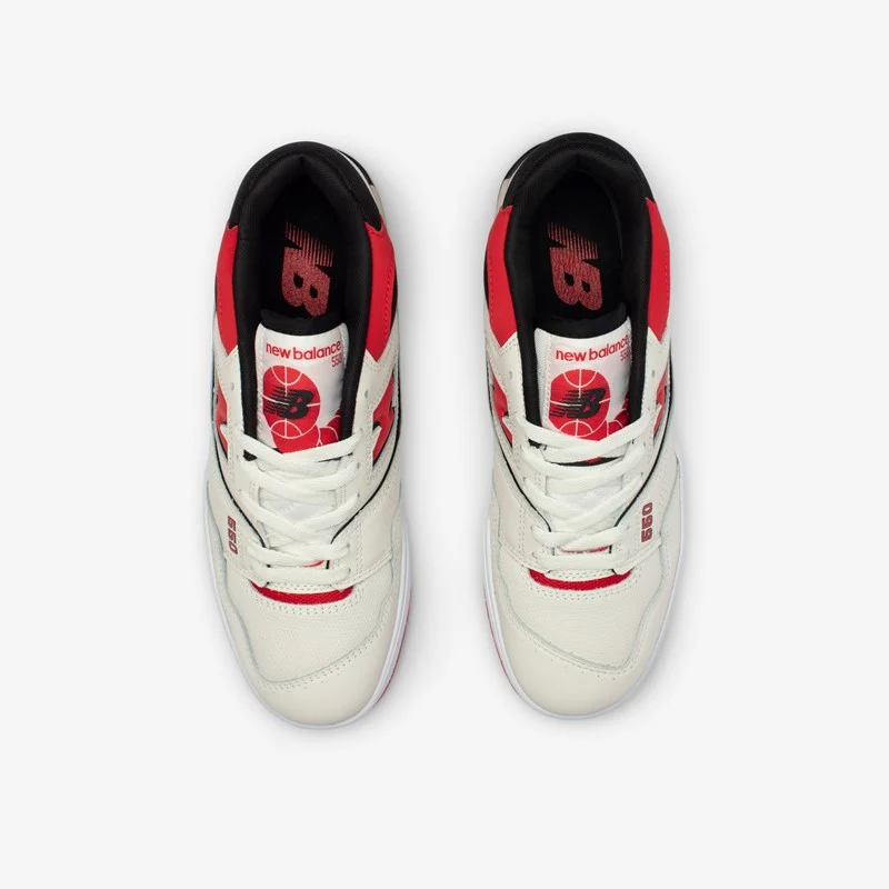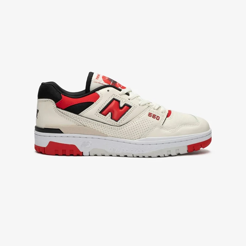 The New Balance 550 with a vintage touch is a d  and is a direct nod to the original form of the end-‘80s basketball sneaker. Made with leather, this blast from the past has a premium leather upper with hits of red to complete the streamlined look.