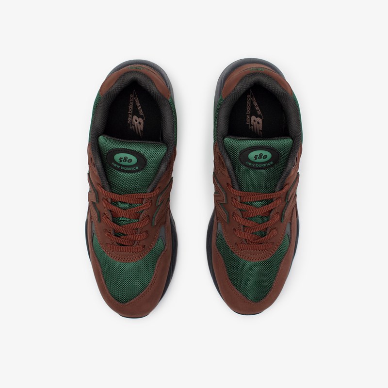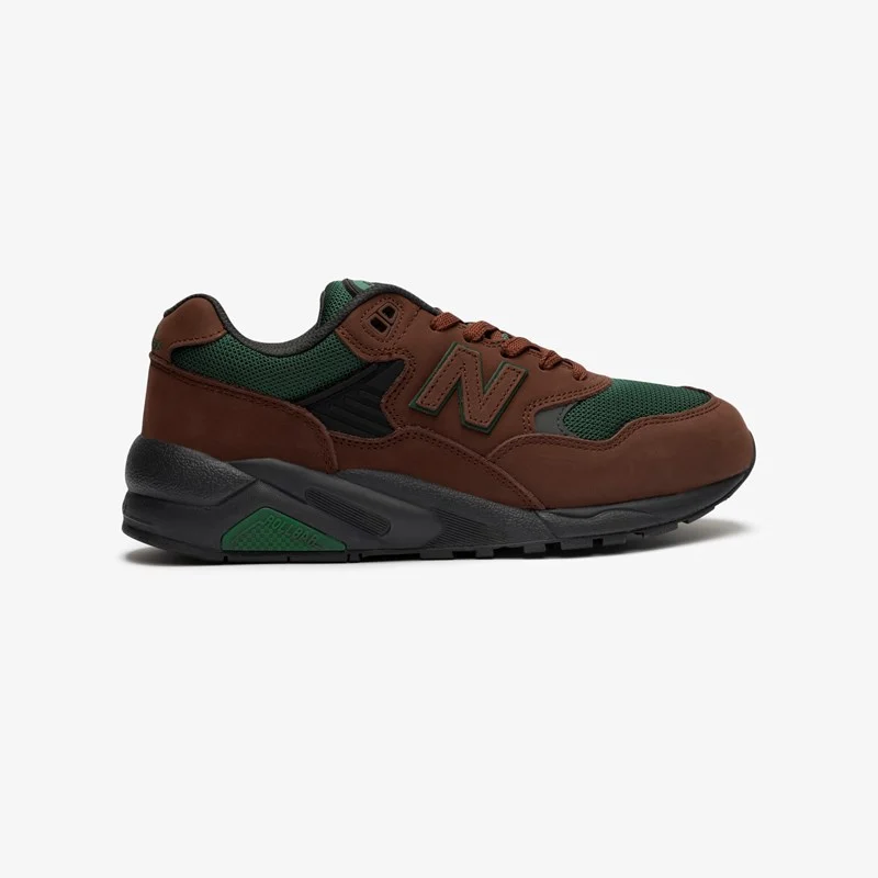 This New Balance 580 brings back one of the most distinctive models in New Balance history. The bulky trail design with its Roll-Bar stabilization technology combines two things needed for an exceptional day outside: looks and feels. The new 580 is an update of the ’90s silhouette that gives the Mahogany and Green NB sneaker a slimmer toe box and lower collar.