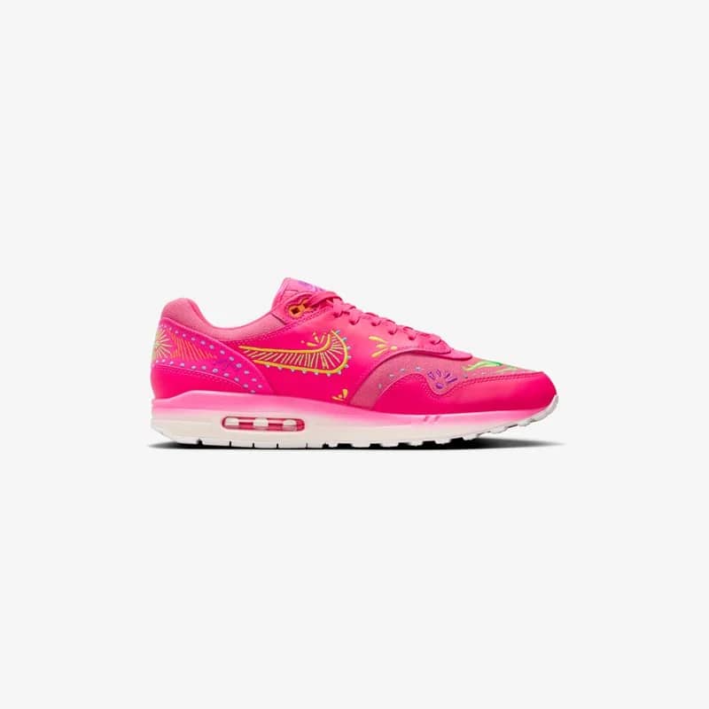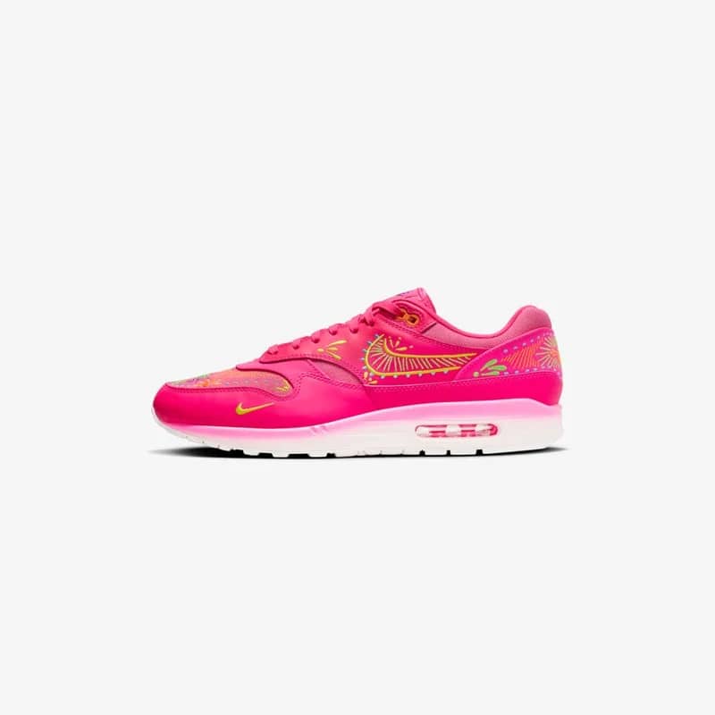 This Nike Air Max 1 PRM is built to celebrate the annual Mexican holiday Dia De Los Muertos, with a bright and bold design, combining a classic look with a vibrant colourway and embroidered detailing. Equipped with a mesh, canvas, and leather construction, this Nike Air Max 1 PRM features intricate floral and sun patterns on the toe box, midfoot, and Swooshes, paying homage to traditional Day of the Dead decorations.