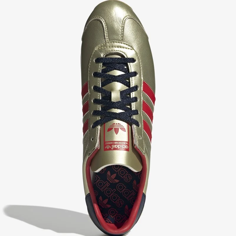 The adidas Country OG originally made its debut back in 1970 and is finally back, arriving in an eye-catching metallic gold colourway with red and navy detailing. Equipped with a smooth leather upper and textile lining, the Country OG features a solid rubber outsole and classic adidas branding on the tongue and sidewall.