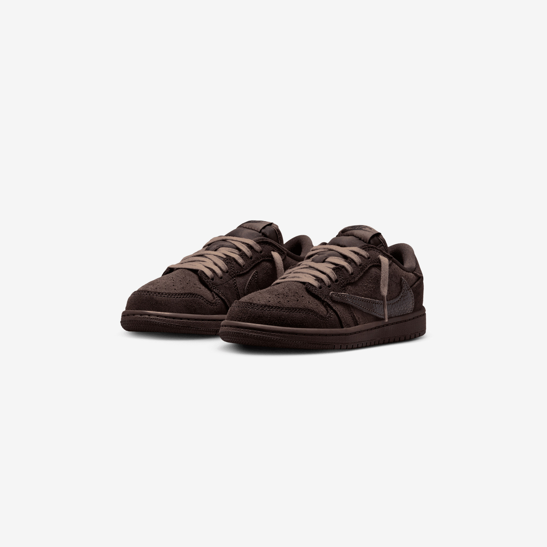 – Jordan Air Jordan 1 Low OG SP (PS) x Travis Scott – Suede and leather upper – Low-cut, padded collar – Perforated toe – Embroidered co-branding – Foam midsole – Rubber outsole
