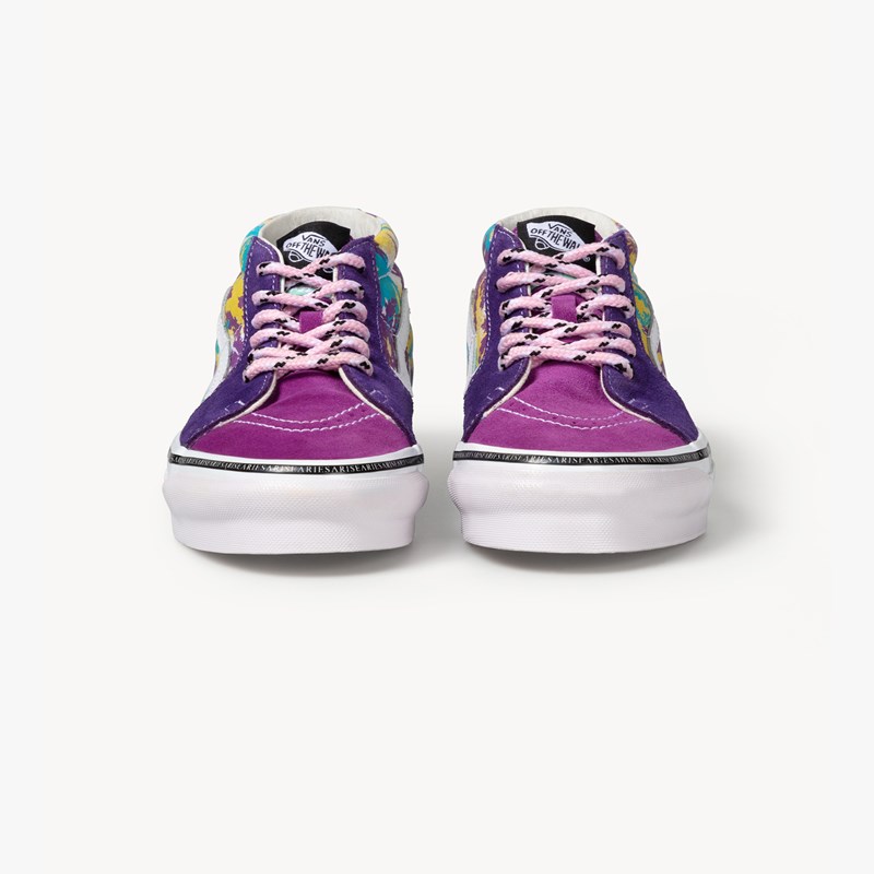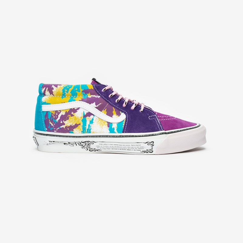 Aries and x Vault by Vans come together for a second time to dress the Vans UA OG SK8-Mid LX with mismatched colors and prints. The mid-top  Vault by Vans SK8-Mid LX features a purple weed print with a canvas and suede construction as well as a branded midsole with an animal print and art nouveau bordered War of the Apocalypse poem.