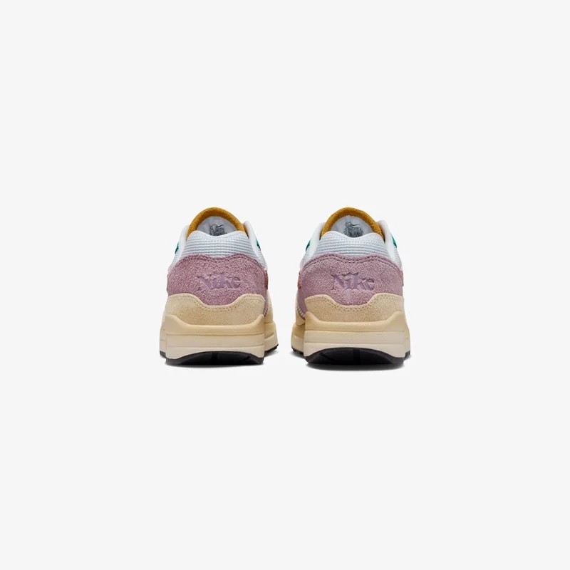 The Air Max 1 ’87 PRM “Tan Lines” effortlessly blends Grain, Burnt Sunrise, Plum Fog, Violet Dust, Deep Royal Blue, and Pure Platinum hues on the upper to create a unique design, complimented by Nike branding on the tongue, heel and outsole, while a black coated rubber outsole completes the look.